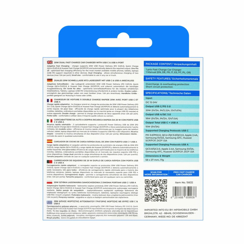 A minőségi autós csereadapter minden olyan eszközhöz alkalmas, amely támogatja az USB Power Delivery 3.0 technológiát, amely akár 70%-kal rövidebb töltési időt tesz lehetővé magasabb feszültség mellett. Az USB-C csatlakozóval nem kompatibilis eszközök töltése normál 5 V-os feszültséggel történik. A tápegység lehetővé teszi az eszközök USB-A csatlakozón keresztüli töltését is a Quick Charge 3.0 szabványnak megfelelően. CE és RoHS tanúsítvánnyal rendelkezik. Az USB-C és USB-A kábel nem tartozék.