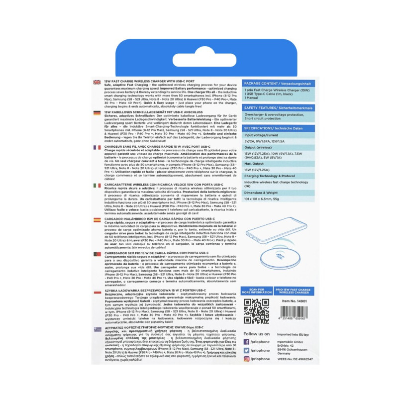 A Prio univerzális vezeték nélküli indukciós töltője lehetővé teszi a Qi szabványt támogató okostelefonok vezeték nélküli töltését. A telefon töltése egyszerű, hiszen elég a töltőállomás lapjára helyezni. Az USB-C csatlakozóval áramforráshoz csatlakoztatott töltőállomás kimeneti teljesítménye 15 W. A maximális töltőáram 2A. USB-C kábel jár hozzá.