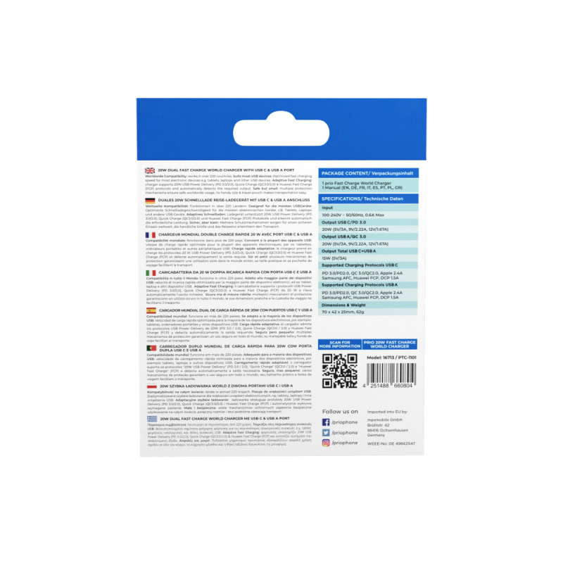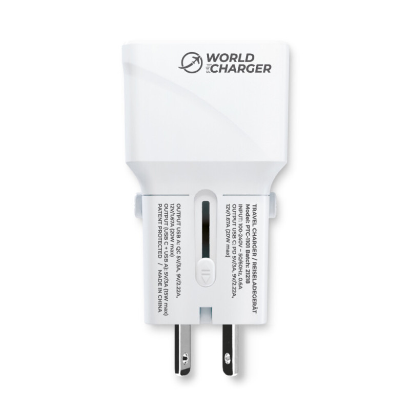 Minőségi univerzális töltő / adapter nemzetközi használatra, négyféle hálózati aljzattal: Európa, Egyesült Királyság, USA és Ausztrália/Kína. Különféle eszközök (fényképezőgépek, mobiltelefonok, táblagépek stb.) töltésére alkalmas USB-A és USB-C csatlakozókon keresztül. A töltő egy szabványos elektromos aljzatba csatlakozik. USB kábel nem tartozék. A maximális kimeneti áram 3 A. A töltő támogatja az USB Power Delivery (PD 3.0/2.0), a Quick Charge (QC3.0/2.0) és a Huawei Fast Charge (FCP) protokollokat, és automatikusan észleli a szükséges kimeneti teljesítményt. A készülék túltöltés-, túláram- és hőmérséklet-védelemmel, valamint CE és RoHS tanúsítvánnyal rendelkezik.