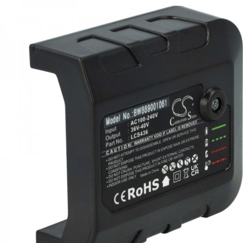 Töltő 36 V-os Li-Ion akkumulátorokhoz, Black & Decker. A töltő túltöltés-, túláram- és hőmérséklet-védelemmel, valamint CE és RoHS tanúsítvánnyal rendelkezik.